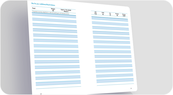 Use for your additional food choices. Weight Approx. Household LEU CHO Fat Protein Energy Food Weight Approx. Household ILE PHE TYR CHO Fat Protein Energy Food (g) Measure (mg) (g) (g) (g) (kcal) (g) Measure (mg) (mg) (mg) (g) (g) (g) (kcal) For greatest accuracy, weigh food on scales that read in grams. All measures are level. For greatest accuracy, weigh food on scales that read in grams. All measures are level. 24 25