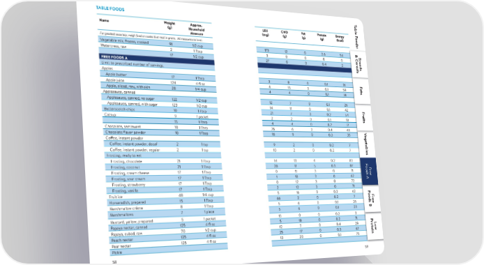 T TABLE FOODS able F Name Weight Approx. LEU CHO Fat Protein Energy oods: (g) Household (mg) (g) (g) (g) (kcal) Measure For greatest accuracy, weigh food on scales that read in grams. All measures are level. & C& C Vegetable mix, frozen, cooked 91 1/2 cup 173 12 0 2.6 54 & CB BB r rr eads erereads eads Watercress, raw 2 1 Tbsp 3 0 0 0 0 ealser eals FREE FOODS A 17 1/2 cup 27 0 0 0.4 2 eals Limit to prescribed number of servings. Apples F Apple butter 17 1 Tbsp 3 8 0 0.1 31 F ats Apple juice 124 4 fl o z 4 15 0 0.1 58 ats Apple, sliced, raw, with skin 28 1/4 cup 4 4 0 0.1 14 Applesauce, canned Applesauce, canned, no sugar 122 1/2 cup 12 7 0 0.1 26 Applesauce, canned, with sugar 123 1/2 cup 14 11 0 0.1 42 F F ruits Butterscotch chips 10 1 Tbsp 21 7 3 0.2 54 ruits Catsup 9 1 packet 2 2 0 0.1 10 15 1 Tbsp 4 4 0 0.2 17 Chocolate, semisweet 10 1 Tbsp 26 6 3 0.4 48 VV V egetablesegetables Chocolate fl avor powder 10 1 Tbsp 16 9 0 0.3 35 egetables Coff ee, instant powder Coff ee, instant powder, decaf 2 1 tsp 9 2 0 0.2 7 Coff ee, instant powder, regular 2 1 tsp 10 2 0 0.2 7 Frosting, ready to eat Frosting, chocolate 21 1 Tbsp 14 13 4 0.2 83 FF F oods AF oods A oods A Frosting, coconut 21 1 Tbsp 20 11 5 0.3 87 oods AFF F F rr r r ee ee ee Frosting, cream cheese 17 1 Tbsp 0 11 3 0 71 ee Frosting, sour cream 17 1 Tbsp 1 10 3 0 62 Frosting, strawberry 17 1 Tbsp 0 12 3 0 72 Frosting, vanilla 17 1 Tbsp 2 12 3 0 71 F Fruit ice 48 1/4 cup 5 16 0 0.2 62 F oods B oods BF F r Horseradish, prepared 15 1 Tbsp 66 2 0 0.2 7 r ee Marshmallow crème 8 1 Tbsp 5 6 0 0.1 26 ee Marshmallows 7 1 piece 5 6 0 0.1 23 Mustard, yellow, prepared 5 1 packet 15 0 0 0.2 3 F Papaya nectar, canned 125 4 fl o z 5 18 0 0.2 71 P oods B r F o L Papaya, cubed, raw 70 1/2 cup 12 7 0 0.4 29 r teinow Peach nectar 125 4 fl o z 25 17 0 0.3 67 ee Pear nectar 125 4 fl o z 13 20 0 0.1 75 Pickle 58 59