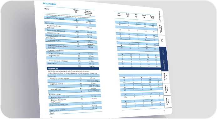 T TABLE FOODS able F Name Weight Approx. LEU CHO Fat Protein Energy oods: (g) Household (mg) (g) (g) (g) (kcal) Measure For greatest accuracy, weigh food on scales that read in grams. All measures are level. & C& C Raisins, seedless, packed 10 1 Tbsp 10 8 0 0.3 29 & CB BB r 41 1/4 cup 39 32 0 1.3 123 rr eads erereads eads ealser eals Raspberries eals Raspberries, frozen, 63 1/4 cup 25 16 0 0.4 65 with sugar Raspberries, heavy syrup 128 1/2 cup 51 30 0 1.1 116 Raspberries, raw 62 1/2 cup 31 7 0 0.6 30 F F ats Rhubarb, frozen, with sugar 120 1/2 cup 24 37 0 0.5 139 ats Strawberries Strawberries, raw 83 1/2 cup 27 6 0 0.5 26 12 1 medium 4 1 0 0.1 4 Strawberries, sliced, frozen, 128 1/2 cup 34 33 0 0.7 121 F F F ruits ruits with sugar ruits Tangerines (mandarins) Tangerine, lite syrup 126 1/2 cup 14 20 0 0.6 62 Tangerine, raw 98 1/2 cup 27 13 0 0.8 52 VVVV V 88 1 medium 25 12 0 0.7 47 V egetablesegetablesegetablesegetables egetables Tangerine juice, with sugar 125 4 fl o z 12 15 0 0.6 62 egetables Watermelon 76 1/2 cup 14 6 0 0.5 23 286 1 wedge 51 22 0 1.7 86 VEGETABLES Weight for raw vegetables is only for parts that can be eaten. F Drain canned, cooked, or frozen vegetables before measuring of weighing. F oods A oods AF Asparagus F r r ee Aspargus, canned, drained 121 1/2 cup 113 3 1 2.6 2 ee 18 1 spear (5” long) 17 0 0 0.4 3 Aspargus, cooked 90 1/2 cup 126 4 0 2.2 20 15 1 spear (5” long) 21 1 0 0.4 3 F F oods B Aspargus, raw 67 1/2 cup 86 3 0 1.5 13 oods BF F r r ee Bamboo shoots 16 1 spear (5” long) 20 1 0 0.4 4 ee Bamboo shoots, cooked 60 1/2 cup 49 1 0 0.9 7 Bamboo shoots, raw 76 1/2 cup 106 4 0 0.2 21 F (1/2” pieces) P oods B r F Bean sprouts, mung, raw 7 1 Tbsp 12 0 0 0.2 2 o L r teinow 52 1/2 cup 91 3 0 1.6 16 ee Beet greens, cooked 72 1/2 cup 83 4 0 1.9 19 Beets 46 47