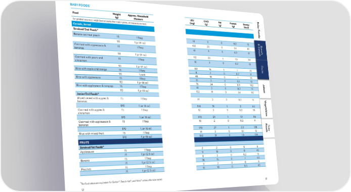 * BABY FOODS B Weight Approx. Household LEU CHO Fat Protein Energy ab Food y (g) Measure (mg) (g) (g) (g) (kcal) F For greatest accuracy, weigh food on scales that read in grams. All measures are level. oods: Cereals, Jarred ® Strained/2nd Foods & C& C & C & CBB B Banana oatmeal peach 16 1 Tbsp 14 3 0 0.2 13 B rr r r eads eads eads er eads erer 113 1 jar (4 oz) 102 20 0 1.4 87 er eals ealseals Oatmeal with applesauce & 16 1 Tbsp 16 3 0 0.2 12 eals bananas 113 1 jar (4 oz) 112 20 1 1.5 94 F F F Oatmeal with pears and 16 1 Tbsp 16 3 0 0.2 13 F ruits ruits ruits cinnamon 99 1 jar (4 oz) 101 16 1 1 70 ruits Rice with apple and mango 16 1 Tbsp 8 3 0 0.2 11 99 1 pack 48 18 0 1 70 Rice with applesauce 16 1Tbsp 10 3 0 0.1 13 J 113 1 jar (4 oz) 76 24 0 0.9 102 uic Rice with applesauce & bananas 16 1 Tbsp 19 3 0 0.2 13 es 113 1 jar (4 oz) 132 19 0 1.4 90 Junior/3rd Foods® Mixed cereal with apples & 15 1 Tbsp 14 2 0 0.2 11 V bananas 170 1 Jar (6 oz) 146 31 1 2 141 egetables F Oatmeal with apples & 15 1 Tbsp 12 2 0 0.2 10 oods BF r cinnamon 170 1 Jar (6 oz) 145 25 1 1.9 116 ee Oatmeal with applesauce & 15 1 Tbsp 15 2 0 0.2 11 bananas F F oods r 170 1 Jar (6 oz) 170 27 1 2.2 128 ee Rice with mixed fruit 15 1 Tbsp 14 3 0 0.1 12 170 1 jar (6 oz) 160 31 0 1.5 134 FRUITS Strained/1st Foods® Applesauce 15 1 Tbsp 2 2 0 0 8 71 1 jar (2.5 oz) 9 10 0 0 40 Banana 15 1 Tbsp 8 3 0 0.2 13 71 1 jar (2.5 oz) 36 15 0 1 60 Peaches 16 1 Tbsp 3 2 0 0 8 71 1 jar (2.5 oz) 15 10 0 0.5 40 * ® ® ® The food values are equivalent for Gerber , Beech-Nut , and Heinz unless otherwise stated. 12 13