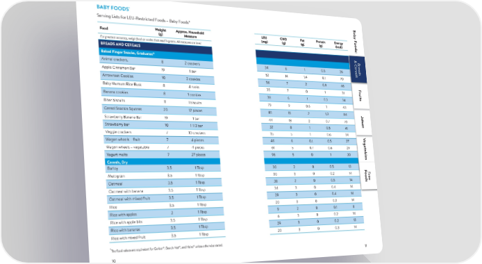 * BABY FOODS B Serving Lists for LEU-Restricted Foods – Baby Foods* ab y F Food Weight Approx. Household LEU CHO Fat Protein Energy oods: (g) Measure (mg) (g) (g) (g) (kcal) For greatest accuracy, weigh food on scales that read in grams. All measures are level. & C& C & C BREADS AND CEREALS & CBB B B rr r ® r eads eads erereads er eads Baked Finger Snacks, Graduates er eals ealseals Animal crackers, 8 2 crackers 34 6 1 0.5 36 eals Apple Cinnamon Bar 19 1 bar 52 14 1.4 0.1 70 Arrowroot Cookies 10 2 cookies 56 7 2 0.9 46 F F ruits Baby Mumum Rice Rusk 8 4 rusks 35 7 0 1 31 ruits Banana cookies 8 1 cookies 38 6 1 0.5 34 Biter biscuits 11 I biscuits 79 9 0.6 1 43 Cereal Snackin Squares 20 12 pieces 85 15 2 1.3 84 J Strawberry Banana Bar 19 1 bar 44 13 2 0.7 70 uic Strawberry bar 10 1-1/3 bar 32 8 1 0.5 41 es Veggie crackers 7 10 crackers 35 5 1 0.6 34 V Wagon wheels – fruit 7 4 pieces 46 6 0.1 0.5 27 egetables Wagon wheels – vegetable 7 4 pieces 61 5 0.7 0.6 29 F oods BF Yogurt melts 7 27 pieces 96 5 0 1 30 r Cereals, Dry ee Barley 3.5 1 Tbsp 30 2 0 0.5 13 FFFFFF Multigrain 3.5 1 Tbsp 30 3 0 0.2 14 oods oods oods rrr ee Oatmeal 3.5 1 Tbsp 38 2 0 0.5 14 ee ee Oatmeal with banana 3.5 1 Tbsp 34 3 0 0.4 14 Oatmeal with mixed fruit 3.5 1 Tbsp 29 3 0 0.4 14 Rice 3.5 1 Tbsp 20 3 0 0.3 14 Rice with apples 2 1 Tbsp 9 2 0 0.1 8 Rice with apple bits 3.5 1 Tbsp 6 3 0 0.2 14 Rice with bananas 3.5 1 Tbsp 29 3 0 0.2 13 Rice with mixed fruit 3.5 1 Tbsp 20 3 0 0.3 14 * ® ® ® The food values are equivalent for Gerber , Beech-Nut , and Heinz unless otherwise stated. 10 11