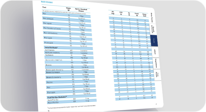 * BABY FOODS B Weight Approx. Household LEU CHO Fat Protein Energy ab Food y (g) Measure (mg) (g) (g) (g) (kcal) F For greatest accuracy, weigh food on scales that read in grams. All measures are level. oods: Pear 16 1 Tbsp 3 3 0 0.1 11 113 1 jar (4 oz) 23 20 0 0.5 82 & C Pear pineapple 16 1 Tbsp 3 2 0 0.1 8 & CB B r 113 1 jar (4 oz) 23 15 0 0.5 64 r eads er eads Pear squash 14 1 Tbsp 6 1 0 0.1 7 er eals 113 1 jar (4 oz) 49 12 0 1.1 53 eals Pear Strawberry Granola 15 1 Tbsp 12 3 0 0.2 12 113 1 pack 87 21 1 1.1 91 Pear wild blueberry 15 1 Tbsp 2 2 0 0.1 10 FF F F ruitsruits ruits 113 1 jar (4 oz) 18 17 0 0.5 73 ruits Plum apple 15 1 Tbsp 2 2 0 0.1 8 113 1 jar (4 oz) 12 14 0 0.3 60 Prune apple 15 1 Tbsp 3 3 0 0.1 11 113 1 jar (4 oz) 24 20 0 0.7 86 J ® uic Junior/3rd Foods Apple banana 142 1 container 43 26 0 0.6 109 es Apple pear raspberry 142 1 container 23 20 0 0.4 82 Applesauce 15 1 Tbsp 2 2 0 0 8 170 1 jar (6 oz) 17 21 0 0.3 87 V Apricot with mixed fruit 16 1 Tbsp 4 2 0 0.1 9 egetables 170 1 jar (6 oz) 44 24 0 1 102 F Bananas 15 1 Tbsp 14 3 0 0.2 14 oods BF r 170 1 jar (6 oz) 155 36 0 1.9 155 ee Banana apple strawberry 142 1 container 91 25 0 1 105 Banana & pineapple 15 1 Tbsp 11 3 0 0.1 11 F oods F 170 1 jar (6 oz) 126 30 0 1.4 124 r Banana & strawberry 15 1 Tbsp 11 3 0 0.2 14 ee 170 1 jar (6 oz) 126 38 0 1.7 160 Peaches 16 1 Tbsp 3 2 0 0.1 9 170 1 jar (6 oz) 34 25 0 1.2 107 Pear 16 1 Tbsp 3 3 0 0.1 11 170 1 jar (6 oz) 34 29 0 0.7 122 Plum apple 15 1 Tbsp 3 2 0 0.1 9 170 1 jar (6 oz) 29 23 0 0.7 97 TM Fruit Pick Ups, Graduates Apple Pick Ups 128 1 tray 9 15 0 0.3 63 Peach Pick Ups 128 1 tray 17 14 0 0.6 61 * ® ® ® The food values are equivalent for Gerber , Beech-Nut , and Heinz unless otherwise stated. 16 17