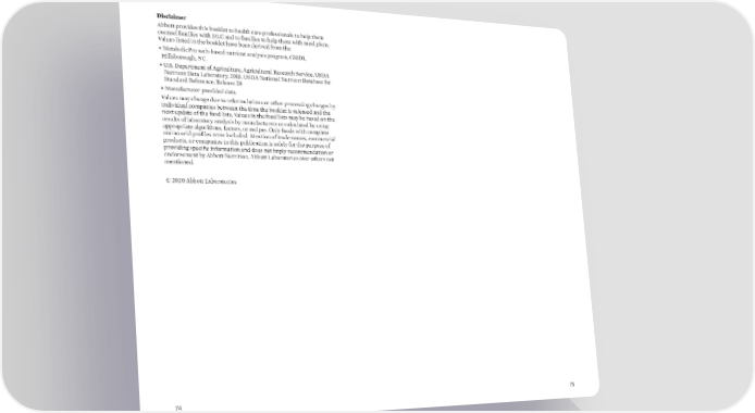 Disclaimer Abbott provides this booklet to health care professionals to help them counsel families with DLC and to families to help them with meal plans. Values listed in the booklet have been derived from the • MetabolicPro web-based nutrient analysis program, GMDI, Hillsborough, NC. • U.S. Department of Agriculture, Agricultural Research Service, USDA Nutrient Data Laboratory, 2015. USDA National Nutrient Database for Standard Reference, Release 28 • Manufacturer provided data. Values may change due to reformulations or other processing changes by individual companies between the time the booklet is released and the next update of the food lists. Values in the food lists may be based on the results of laboratory analysis by manufacturers or calculated by using appropriate algorithms, factors, or recipes. Only foods with complete amino acid profiles were included. Mention of trade names, commercial products, or companies in this publication is solely for the purpose of providing specific information and does not imply recommendation or endorsement by Abbott Nutrition, Abbott Laboratories over others not mentioned. © 2020 Abbott Laboratories 74 75