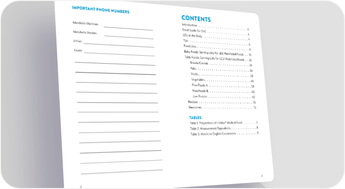 IMPORTANT PHONE NUMBERS CONTENTS Introduction . . . . . . . . . . . . . . . . . . . . . . . . . . 4 Metabolic Dietitian: Food Guide for DLC . . . . . . . . . . . . . . . . . . . . . . 4 LEU in the Body . . . . . . . . . . . . . . . . . . . . . . . . 4 Metabolic Doctor: Tips . . . . . . . . . . . . . . . . . . . . . . . . . . . . . . . 6 Other: Food Lists . . . . . . . . . . . . . . . . . . . . . . . . . . . .9 Baby Foods: Serving Lists for LEU-Restricted Foods . . 10 Goals: Table Foods: Serving Lists for LEU-Restricted Foods . . 26 ___________________________________________________________________________________________________ Breads/Cereals . . . . . . . . . . . . . . . . . . . . . 26 Fats . . . . . . . . . . . . . . . . . . . . . . . . . . . . 36 ___________________________________________________________________________________________________ Fruits . . . . . . . . . . . . . . . . . . . . . . . . . . . 38 Vegetables. . . . . . . . . . . . . . . . . . . . . . . . 46 ___________________________________________________________________________________________________ Free Foods A . . . . . . . . . . . . . . . . . . . . . . 58 ___________________________________________________________________________________________________ Free Foods B. . . . . . . . . . . . . . . . . . . . . . . 60 Low Protein . . . . . . . . . . . . . . . . . . . . . . . 62 ___________________________________________________________________________________________________ Recipes . . . . . . . . . . . . . . . . . . . . . . . . . . . . 70 Resources. . . . . . . . . . . . . . . . . . . . . . . . . . . 72 ___________________________________________________________________________________________________ ___________________________________________________________________________________________________ TABLES ® Table 1. Preparation of I-Valex Medical Food . . . . . . . 5 ___________________________________________________________________________________________________ Table 2. Measurement Equivalents. . . . . . . . . . . . . .8 Table 3. Metric to English Conversions . . . . . . . . . . . 9 ___________________________________________________________________________________________________ ___________________________________________________________________________________________________ ___________________________________________________________________________________________________ ___________________________________________________________________________________________________ 2 3