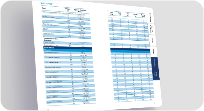 * BABY FOODS B ab Weight Approx. Household LEU CHO Fat Protein Energy y Food (g) Measure (mg) (g) (g) (g) (kcal) F For greatest accuracy, weigh food on scales that read in grams. All measures are level. oods: 170 1 jar (6 oz) 141 15 0 2 71 Mixed vegetables 15 1 Tbsp 20 1 0 0.2 5 & C& C 170 1 jar (6 oz) 224 14 1 2.4 61 & CB BB r rr eads erereads eads 216 1 jar (7.5 oz) 197 18 1 3 78 ealser eals Peas with rice 14 1 Tbsp 25 1 0 0.3 7 eals 170 1 jar (6 oz) 296 17 1 4.1 88 Squash 14 1 Tbsp 5 1 0 0.1 5 170 1 jar (6 oz) 63 12 0 1.4 56 F Sweet potatoes 14 1 Tbsp 10 2 0 0.2 8 F ruits 170 1 jar (6 oz) 121 24 0 1.9 102 ruits Vegetable Pick Ups, GraduatesĀ® Carrot Pick Ups 71 1 tray 36 4 0 0.4 19 Green bean Pick Ups 113 1 tray 74 4 0 0.9 18 J FREE FOODS uic Desserts es Dutch apple dessert 2 15 1 Tbsp 2 3 0 0 12 113 1 jar (4 oz) 11 23 0 0.2 92 VV Fruit medley dessert 2 15 1 Tbsp 2 3 0 0.1 12 V egetablesegetables 113 1 jar (4 oz) 11 22 0 0.5 90 egetables Fruit medley dessert 3 15 1 Tbsp 2 3 0 0.1 11 F oods BF 170 1 jar (6 oz) 17 31 0 0.5 128 r Guava tropical dessert 15 1 Tbsp 2 3 0 0 11 ee 113 1 jar (4 oz) 11 20 0 0 80 Hawaiian delight 2 15 1 Tbsp 15 3 0 0.2 13 F F F oods F oods r 113 1 jar (4 oz) 113 23 0 1.5 99 r ee Hawaiian delight 3 15 1 Tbsp 15 3 0 0.2 14 ee 170 1 jar (6 oz) 170 35 0 2.2 153 Mango tropical dessert 15 1 Tbsp 2 3 0 0 11 113 1 jar (4 oz) 18 20 0 0 84 Papaya tropical dessert 15 1 Tbsp 1 2 0 0 10 113 1 jar (4 oz) 9 18 0 0 73 Peach cobbler 2 15 1 Tbsp 2 3 0 0.1 11 113 1 jar (4 oz) 18 21 0 0.6 86 Peach cobbler 3 15 1 Tbsp 3 3 0 0.1 11 170 1 jar (6 oz) 32 31 0 0.9 129 Tropical fruit blend 2 15 1 Tbsp 6 3 0 0.1 11 113 1 jar (4 oz) 49 20 0 0.8 85 22 23