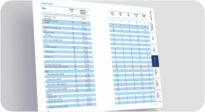 T TABLE FOODS able F Name Weight Approx. LEU CHO Fat Protein Energy oods: (g) Household (mg) (g) (g) (g) (kcal) Measure For greatest accuracy, weigh food on scales that read in grams. All measures are level. & C& C Mushroom, enoki, 3 1 piece 4 0 0 0.1 1 & CB BB r raw, whole rr eads erereads eads Mushroom, shiitake, 18 1 piece 17 3 0 0.3 10 ealser eals cooked eals 73 1/2 cup 68 11 0 1.1 41 Mushroom, shiitake, dry 3.6 1 piece 24 3 0 0.3 11 Okra F Okra, cooked 80 1/2 cup 79 6 0 1.5 18 F ats Okra, raw 12 1 piece 13 1 0 0.2 5 ats 50 1/2 cup 52 4 0 1 19 Onion rings, breaded, fried 12 1/4 cup 43 4 2 0.3 33 6 1 piece 21 2 1 0.3 17 F Onions F ruits Onions, cooked 15 1 Tbsp 6 1 0 0.2 6 ruits 105 1/2 cup 51 11 0 1.4 46 Onions, raw 10 1 Tbsp 3 1 0 0.1 4 40 1/4 cup 10 4 0 0.4 15 VVV V V egetablesegetablesegetables egetables Parsley, raw 4 1 Tbsp 8 0 0 0.1 1 egetables 15 1/4 cup 31 1 0 0.5 6 1 1 sprig 2 0 0 0 0 Parsnips, sliced, cooked 78 1/2 cup 39 15 0 1 63 Peas with carrots, frozen, cooked 10 1 Tbsp 18 1 0 0.3 5 F 80 1/2 cup 148 8 0 2.5 39 F oods A oods AF Peas F r r ee Peas, edible pod, cooked 10 1 Tbsp 27 1 0 0.4 4 ee 80 1/2 cup 215 6 0 2.8 34 Peas, green, cooked 10 1 Tbsp 32 1 0 0.5 8 80 1/2 cup 257 11 0 4.1 62 F F oods B Peas, green, edible pod, raw 6 1 Tbsp 14 0 0 0.2 3 oods BF F r r ee 49 1/2 cup 112 4 0 1.4 21 ee Peas, green, frozen, cooked 10 1 Tbsp 31 1 0 0.5 8 80 1/2 cup 247 11 0 4.1 63 Peppers F Green chili P oods B r F o L r Green chili, canned 70 1/2 cup 27 3 0 0.5 15 teinow Green chili, hot, raw 45 1 piece 47 4 0 0.9 18 ee 75 1/2 cup 79 7 0 1.5 30 JalapeƱo, chopped, canned 34 1/4 cup 16 2 0 0.3 9 52 53