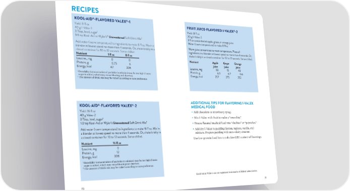 RECIPES ® ® KOOL-AID -FLAVORED VALEX -1 ® Yield: 8 fl oz FRUIT JUICE-FLAVORED I-VALEX -2 40 g I-Valex-1 Yield: 8 fl oz 1 20 g I-Valex-2 3 Tbsp, level, sugar 3 fl oz concentrated apple, grape, or orange juice ® 2 1/4 tsp Kool-Aid or Wyler’s Unsweetened Soft Drink Mix Water (room temperature) to make 8 fl oz Add water (room temperature) to ingredients to make 8 fl oz. Mix in a Warm juice concentrate to room temperature. Place all blender at lowest speed no more than 4 seconds. Or, shake briskly in a ingredients in a blender at lowest speed no more than 4 seconds. Or, closed container for 10 to 12 seconds. Serve chilled. shake briskly in a closed container for 10 to 12 seconds. Serve chilled. Nutrient 1 fl oz 8 fl oz Leucine,, mg 0 0 Nutrient Apple Grape Orange Protein, g 0.75 6 juice juice juice Energy, kcal 42 336 Leucine, mg 33 15 48 1 Osmolality (concentration of particles in solution) may be too high if more Protein, g 6.5 6.7 8.6 sugar is added, which may cause bloating and diarrhea. Energy, kcal 257 275 252 2 The amount of drink mix may be varied according to taste preference. ® ® ADDITIONAL TIPS FOR FLAVORING I-VALEX KOOL-AID -FLAVORED VALEX -2 MEDICAL FOOD Yield: 16 fl oz • Add chocolate or strawberry syrup. 40 g Valex-2 1 • Mix I-Valex with fruit to make a “smoothie.” 3 Tbsp, level, sugar 2 1/2 tsp Kool-Aid or Wyler’s Unsweetened Soft Drink Mix • Freeze flavored medical food into “slushies” or “popsicles.” Add water (room temperature) to ingredients to make 16 fl oz. Mix in • Add dry I-Valex to pudding (lemon, tapioca, vanilla, etc) a blender at lowest speed no more than 4 seconds. Or, shake briskly in mixture. Prepare pudding with non—dairy creamer. a closed container for 10 to 12 seconds. Serve chilled. Use low-protein food lists to calculate LEU content of flavorings. Nutrient 16 fl oz Leucine, mg 0 Protein, g 12 Energy, kcal 308 1 Osmolality (concentration of particles in solution) may be too high if more sugar is added, which may cause bloating and diarrhea. 2 The amount of drink mix may be varied according to taste preference. Kool-Aid & Wyler’s are not registered trademarks of Abbott Laboratories. 70 71