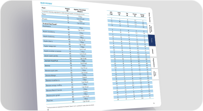 * BABY FOODS B ab Weight Approx. Household LEU CHO Fat Protein Energy y Food (g) Measure (mg) (g) (g) (g) (kcal) F For greatest accuracy, weigh food on scales that read in grams. All measures are level. oods: Pears 16 1 Tbsp 3 2 0 0.1 8 71 1 jar (2.5 oz) 15 10 0 0.3 40 & C Prunes 15 1 Tbsp 7 4 0 0.2 15 & CB B r 71 1 jar (2.5 oz) 31 17 0 1 70 r eads er eads ® er eals Strained/2nd Foods eals Applesauce 15 1 Tbsp 2 2 0 0 8 113 1 jar (4 oz) 11 14 0 0.2 58 Apple blackberry 15 1 Tbsp 2 2 0 0 8 FF F F ruitsruits 113 1 pack 14 14 0 0 57 ruits Apple blueberry 15 1 Tbsp 2 2 0 0 8 ruits 113 1 jar (4 oz) 11 14 0 0.2 57 Apple cherry 15 1 Tbsp 2 2 0 0 8 113 1 jar (4 oz) 11 16 0 0.2 64 Apple mango kiwi 15 1 Tbsp 6 2 0 0 9 J 113 1 jar (4 oz) 49 16 0 0.2 67 uic Apple strawberry banana 15 1 Tbsp 3 2 0 0.1 9 es 113 1 jar (4 oz) 20 16 0 0.3 68 Apple sweet potato 15 1Tbsp 2 2 0 0.1 9 V 113 1 jar (4 oz) 18 16 0 0.3 64 egetables Apricot mixed fruit 15 1 Tbsp 4 2 0 0.1 9 F 113 1 jar (4 oz) 29 16 0 0.7 68 oods BF r Banana 15 1Tbsp 13 3 0 0.2 14 ee 113 1 jar (4 oz) 103 24 0 1.2 103 Banana apple pear 15 1 Tbsp 11 3 0 0.1 13 113 1 jar (4 oz) 79 23 0 1 96 F F oods r Banana Mango 15 1 Tbsp 10 3 0 0.2 12 ee 99 1 pouch 63 21 0 1 80 Banana mixed berry 15 1 Tbsp 11 3 0 0.2 13 113 1 jar (4 oz) 82 24 0 1.2 101 Banana orange medley 15 1 Tbsp 10 3 0 0.2 14 113 1 jar (4 oz) 73 25 0.2 1.1 106 Banana Peach Granola 15 1 Tbsp 13 3 0 0.2 12 113 1 pack 97 23 1 1.1 91 Banana plum grape 15 1 Tbsp 10 4 0 0.2 15 113 1 jar (4 oz) 75 27 0 1.1 113 Peaches 16 1 Tbsp 4 2 0 0.1 9 113 1 jar (4 oz) 28 17 0 0.8 71 * ® ® ® The food values are equivalent for Gerber , Beech-Nut , and Heinz unless otherwise stated. 14 15