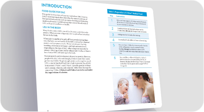 INTRODUCTION Table 1. Preparation of I-Valex® Medical Food FOOD GUIDE FOR DLC Step Instructions This guide for Disorders of Leucine Catabolism (DLC) leucine 1 Mix a 24-hour supply of I-Valex medical formula (LEU)-restricted meal plans identifies the amount and type of all at once or in individual servings as instructed food permitted each day and can make checking and balancing by your metabolic dietitian. meals much easier. Careful eating helps control blood levels of LEU, with positive effects on health. 2 Carefully follow mixing instructions on the LEU IN THE BODY I-Valexlabel. Do not mix longer than instructed. Many foods contain LEU, one of the 20 amino acids that make 3 Refrigerate the formula after mixing. protein. When protein is digested, LEU is split off and absorbed for use in the body. 4 Use medical food within 24 hours after mixing. When LEU is unable to be split off from protein during diges- tion, the body cannot handle all the LEU coming from digested For an infant, I-Valex-1 mixture stored in bottles protein and symptoms result.. These include poor feeding, 5 in the refrigerator may be warmed before vomiting, drowsiness (lethargy), and high ammonia levels. feeding. Do not heat mixture above 100°F Depending on the type of DLC, other symptoms may also be (37.8°C) or add hot water. Heat can cause vitamin present. Limiting protein intake reduces LEU intake, so there is loss. less chance LEU will build up in the body. Normal growth and development depend on protein. However, 6 For a toddler or older child/adult, I-Valex-2 people with DLC who eat enough protein to meet their needs mixture may be consumed plain, chilled, or get too much LEU. To get enough protein and not get too much flavored. Recipes for flavoring I-Valex-2 are found LEU, a special medical food that is high in protein, free of LEU in the DLC family guide and on pages 70-71 of ® ® is necessary. I-Valex -1 and I-Valex -2 provide protein (without this guide. LEU), energy, vitamins, and minerals. Table 1 lists the steps for preparing I-Valex. I-Valex-1 and I-Valex-2 are to be used under the supervision of a doctor. 4 5