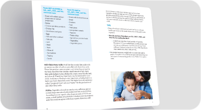 more is known on this topic, the best approach is to limit Foods NOT ALLOWED in Foods TO LIMIT in vegetable oils that are high in PUFAs to the amount required to ILE-, MET-, THR-, and VAL- ILE-, MET-, THR-, and VAL- provide essential fatty acids. Coconut oil, palm oil, and peanut oil restricted meals restricted meals are low in PUFAs and may be used as energy (calorie) sources. • Bread with added calcium • Breast milk & infant formula Ask your metabolic doctor or dietitian which is best for your propionate or sodium • Bread child. propionate • Crackers TIPS • Butter • Fruit • Keep a list of your individualized goals (set by you and your • Cheese and dairy products • Fruit juices health care team) on the inside front cover of this guide (write • Chicken fat • Low-protein cereals in pencil). • Dried beans and peas • Popcorn • How do you know if products are ILE-, MET-, THR-, and • Eggs • Potato chips VAL-free by reading the label? • Fish and other seafood • Special low-protein foods — A label may state that a food contains “0” protein. • Fish oils • Vegetables The zero or “0” is a rounded figure, and the product may • Lard • Vegetable juices contain up to 0.49 grams of protein per serving. Check • Meat with your dietitian or look to see if any of the ingredients • Nuts may contain ILE, MET, THR, or VAL. • Olive oil • For greatest accuracy, weigh foods on a scale that reads in • Nut butters grams. If a scale is not available, use approved measuring cups • Poultry and spoons for measuring portion sizes. Table 2 lists equiva- • Seeds lents. Odd-Chain Fatty Acids. Food fats that contain fatty acids with an uneven number of carbons are called odd-chain fatty acids. These fats produce some propionic acid when they are used in the body. Food fats that contain a small amount of odd-chain fatty acids include butter, chicken fat, cream, some fish oils, lard, and olive oil. Therefore, these foods may be restricted for your child. Avoidance of fasting is very important, as fasting leads to a build-up of odd-chain fatty acids. The higher level of a substance called “propionyl-CoA” acts as a “starter” for the production of odd-chain fatty acids. PUFAs. Vegetable oils such as canola, corn, safÒower, and soy contain large amounts of polyunsaturated fatty acids (PUFAs). According to some reports, when large amounts of PUFAs are eaten, a small portion of each PUFA is broken down to propionic acid. Not everyone agrees with these reports. However, until 6 7