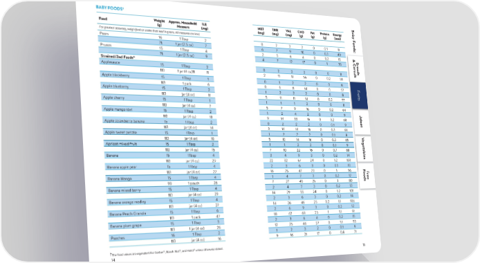 † BABY FOODS B ab Weight Approx. Household ILE MET THR VAL CHO Fat Protein Energy y Food (g) Measure (mg) (mg) (mg) (mg) (g) (g) (g) (kcal) F For greatest accuracy, weigh food on scales that read in grams. All measures are level. oods: Pears 16 1 Tbsp 2 0 2 3 2 0 0.1 8 71 1 jar (2.5 oz) 7 6 7 9 10 0 0.3 40 & C Prunes 15 1 Tbsp 4 2 5 6 4 0 0.2 15 & CB B r 71 1 jar (2.5 oz) 9 4 7 12 17 0 1 70 r eads er eads ® er eals Strained/2nd Foods eals Applesauce 15 1 Tbsp 2 0 2 2 2 0 0 8 113 1 jar (4 oz)11 11 2 11 11 14 0 0.2 58 Apple blackberry 15 1 Tbsp 1 0 1 2 2 0 0 8 FF F F ruitsruits 113 1 pack 6 0 6 11 14 0 0 57 ruits Apple blueberry 15 1 Tbsp 2 1 2 2 2 0 0 8 ruits 113 jar (4 oz) 11 5 11 11 14 0 0.2 57 Apple cherry 15 1 Tbsp 1 1 1 1 2 0 0 8 113 jar (4 oz) 7 5 7 9 16 0 0.2 64 Apple mango kiwi 15 1 Tbsp 2 1 2 4 2 0 0 9 J 113 jar (4 oz) 18 9 14 33 16 0 0.2 68 uic Apple strawberry banana 15 1 Tbsp 2 0 2 2 2 0 0.1 9 es 113 jar (4 oz) 14 3 14 14 16 0 0.3 64 Apple sweet potato 15 1Tbsp 1 1 2 2 2 0 0.1 8 V 113 jar (4 oz) 10 5 12 14 16 0 0.3 65 egetables Apricot mixed fruit 15 1 Tbsp 2 1 1 3 2 0 0.1 9 F 113 jar (4 oz) 15 7 10 22 16 0 0.7 68 oods BF r Banana 15 1Tbsp 4 3 4 9 3 0 0.2 14 ee 113 jar (4 oz) 29 22 32 67 24 0 1.2 103 Banana apple pear 15 1 Tbsp 4 2 3 6 3 0 0.1 13 113 jar (4 oz) 27 16 25 47 23 0 1 96 F F oods r Banana Mango 15 1 Tbsp 4 1 4 7 3 0 0.2 12 ee 99 1 pouch 26 7 27 45 21 0 1 80 Banana mixed berry 15 1 Tbsp 4 2 4 7 3 0 0.2 13 113 jar (4 oz) 29 14 29 55 24 0 1.2 101 Banana orange medley 15 1 Tbsp 4 2 3 6 3 0 0.2 14 113 jar (4 oz) 27 14 26 46 25 0.2 1.1 106 Banana Peach Granola 15 1 Tbsp 6 2 6 9 3 0 0.2 12 113 1 pack 47 18 42 69 23 1 1.1 91 Banana plum grape 15 1 Tbsp 3 2 3 6 4 0 0.2 15 113 1 jar (4 oz) 26 12 25 46 27 0 1.1 113 Peaches 16 1 Tbsp 2 1 2 3 2 0 0.1 9 113 jar (4 oz) 16 9 16 21 17 0 0.8 71 † ® ® ® The food values are equivalent for Gerber , Beech-Nut , and Heinz unless otherwise stated. 14 15