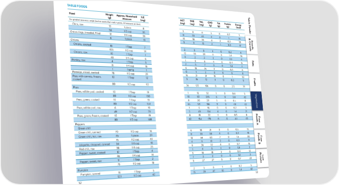 T TABLE FOODS able F Food Weight Approx. Household ILE MET THR VAL CHO Fat Protein Energy oods: (g) Measure (mg) (mg) (mg) (mg) (g) (g) (g) (kcal) For greatest accuracy, weigh food on scales that read in grams. All measures are level. Okra, raw 12 1 piece 8 3 8 11 1 0 0.2 5 & C& C 50 1/2 cup 35 11 33 46 4 0 1 19 & CB BB r rr eads erereads eads Onion rings, breaded, fried 12 1/4 cup 26 10 18 26 4 2 0.3 33 ealser eals Onions 6 1 piece 13 5 9 13 2 1 0.3 17 eals Onions, cooked 15 1 Tbsp 7 2 5 5 1 0 0.2 6 105 1/2 cup 51 12 35 33 11 0 1.4 46 F Onions, raw 10 1 Tbsp 1 0 2 2 1 0 0.1 4 F ats 40 1/4 cup 6 1 8 8 4 0 0.4 15 ats Parsley, raw 4 1 Tbsp 5 2 5 7 0 0 0.1 1 15 1/4 cup 18 6 18 26 1 0 0.5 6 1 1 sprig 1 0 1 2 0 0 0 0 Parsnips, sliced, cooked 78 1/2 cup 39 16 31 31 15 0 1 63 F F ruits Peas with carrots, frozen, 10 1 Tbsp 12 5 16 13 1 0 0.3 5 ruits cooked 80 1/2 cup 93 36 125 106 8 0 2.5 39 Peas VVV V Peas, edible pod, cooked 10 1 Tbsp 19 1 12 32 1 0 0.4 5 V egetablesegetablesegetables egetables 80 1/2 cup 150 10 92 255 6 0 2.8 42 egetables Peas, green, cooked 10 1 Tbsp 19 8 20 23 1 0 0.5 8 80 1/2 cup 154 65 161 186 11 0 4.1 62 Peas, edible pod, raw 6 1 Tbsp 10 1 6 16 0 0 0.2 3 49 1/2 cup 79 5 49 134 4 0 1.4 21 F F oods A Peas, green, frozen, cooked 10 1 Tbsp 19 8 19 22 1 0 0.5 8 oods AF F r r ee Peppers 80 1/2 cup 148 62 154 178 11 0 4.1 63 ee Green chili Green chili, canned 70 1/2 cup 16 6 18 21 3 0 0.5 15 F Green chili, hot, raw 45 1 piece 29 11 33 38 4 0 0.9 18 F oods B oods BF 75 1/2 cup 49 18 56 63 7 0 1.5 30 F r r ee JalapeƱo, chopped, canned 34 1/4 cup 10 4 11 13 2 0 0.3 9 ee Red chili, raw 38 1/4 cup 25 9 28 32 4 0 0.7 16 Pepper, sweet, cooked 12 1 Tbsp 4 1 4 5 1 0 0.1 2 46 1/4 cup 14 5 16 18 3 0 0.4 12 F P oods B r F Pepper, sweet, raw 9 1 Tbsp 2 1 3 3 0 0 0.1 3 o L r teinow Pumpkin 75 1/2 cup 18 5 27 27 5 0 0.7 23 ee Pumpkin, canned 16 1 Tbsp 5 2 5 6 1 0 0.2 5 123 1/2 cup 42 15 39 47 10 0 1.4 42 52 53