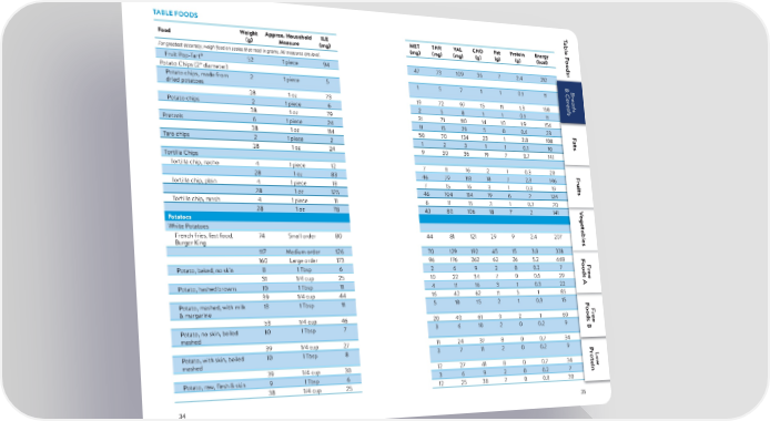 T TABLE FOODS able F Food Weight Approx. Household ILE MET THR VAL CHO Fat Protein Energy oods: (g) Measure (mg) (mg) (mg) (mg) (g) (g) (g) (kcal) For greatest accuracy, weigh food on scales that read in grams. All measures are level. Fruit Pop-Tart® 52 1 piece 94 47 73 109 36 7 2.4 212 & C& C & C Potato Chips (2” diameter) & CBB B B rr r r eads eads erereads er eads Potato chips, made from 2 1 piece 5 1 5 7 1 1 0.1 11 er eals ealseals dried potatoes 28 1 oz 73 19 72 97 15 11 1.3 158 eals Potato chips 2 1 piece 6 2 5 8 1 1 0.1 11 28 1 oz 79 31 71 110 14 10 1.9 154 Pretzels 6 1 piece 24 11 15 29 5 0 0.6 23 F F ats 28 1 oz 114 50 70 134 23 1 2.8 108 ats Taro chips 2 1 piece 2 1 2 3 1 1 0.1 10 28 1 oz 24 9 30 36 19 7 0.7 141 Tortilla Chips Tortilla chip, nacho 4 1 piece 12 7 11 16 2 1 0.3 20 F F ruits 28 1 oz 83 46 79 113 18 7 2.3 146 ruits Tortilla chip, plain 4 1 piece 18 7 15 16 3 1 0.3 19 28 1 oz 125 46 104 114 19 6 2 134 Tortilla chip, ranch 4 1 piece 11 6 11 15 3 1 0.3 20 VV 28 1 oz 78 43 80 106 18 7 2 141 V egetablesegetables Potatoes egetables White Potatoes French fries, fast food, 74 Small order 80 44 81 121 29 9 2.4 207 Burger King 117 Medium order 126 70 129 192 45 15 3.8 328 F 160 Large order 173 96 176 262 62 26 5.2 448 F oods A oods AF F r Potato, baked, no skin 8 1 Tbsp 6 2 6 9 2 0 0.2 7 r ee 31 1/4 cup 25 10 22 34 7 0 0.6 29 ee Potato, hashed browns 10 1 Tbsp 11 4 11 16 3 1 0.3 22 39 1/4 cup 44 16 42 62 11 5 1 85 Potato, mashed, with milk 13 1 Tbsp 11 5 10 15 2 1 0.3 15 F F oods B & margarine oods BF F r r ee 53 1/4 cup 46 20 40 61 9 2 1 60 ee Potato, no skin, boiled 10 1 Tbsp 7 3 6 10 2 0 0.2 9 mashed 39 1/4 cup 27 11 24 37 8 0 0.7 34 Potato, with skin, boiled 10 1 Tbsp 8 3 7 11 2 0 0.2 9 F P oods B r F mashed o L r teinow 39 1/4 cup 30 12 27 41 8 0 0.7 34 ee Potato, raw, fl esh & skin 9 1 Tbsp 6 3 6 9 2 0 0.2 7 38 1/4 cup 25 12 25 38 7 0 0.8 30 34 35