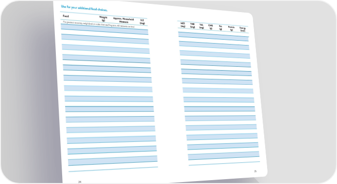 Use for your additional food choices. FFoodood WeightWeightApprAopprx. Hoouseholdx. Household ILE ILE PHE MET TYRTHR CHOVA L CHOFat PrFaoteint PErneroteingy Energy (g) (g) MeasurMeasure e (mg) (mg) (mg) (mg)(mg)(mg) (g(mg)) (g(g)) (g(g)) (k(gcal)) (kcal) ForFor gr greatest aceatest accurcuracyacy, w, weigh eigh food on scfood on scales ales that rthat read in gread in grams. All measurams. All measures ares are lee level.vel. 24 25