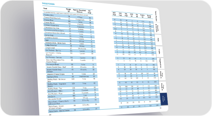T TABLE FOODS able F Food Weight Approx. Household ILE MET THR VAL CHO Fat Protein Energy oods: (g) Measure (mg) (mg) (mg) (mg) (g) (g) (g) (kcal) For greatest accuracy, weigh food on scales that read in grams. All measures are level. Cheddar Whiz 28 2 Tbsps 39 17 36 45 4 6 0.75 70 & C& C Cheese Filled Meatballs 72 2 veggie balls 28 9 32 41 20 4.5 1.2 130 & CB BB r rr eads erereads eads Cheese Pizza 139 1 pizza 38 9 39 45 56 8 1 300 ealser eals Cheese Ravioli 54 4 raviolis 14 7 15 17 24 3 0.4 120 eals Chicken Consomme 3 1 teaspoon 1 0.2 1 1 1 0 0.2 5 Chocolate Cha-Chas 24 4 pieces 17 8 17 23 14 9 0.3 140 Cinnamon and Raisin Gems 45 1 cookie 17 6 16 19 24 10 0.3 180 F Cinnamon Raisin Swirl Bread 50 1 slice 5 5 5 10 27 1.5 0.2 140 F ats Corny Dogs 50 1 dog 11 5 13 15 24 7 0.3 160 ats Cranberry Scones 58 1 scone 3 2 3 5 35 9 0.2 220 Eggz 16 1/4 cup 6 1 3 6 12 2.5 0.1 70 Focaccia Sticks - Italian Style 51 1 stick 12 3 13 16 24 3 0.3 120 Fudgy Brownies 38 1/6 tray 13 4 16 18 22 8 0.27 160 F F ruits Gingerbread 57 1/4 of a tray 6 2 5 7 26 8 0.2 170 ruits Go! Pockets - Burrito 130 1 pocket 26 5 26 48 48 4.5 0.9 230 Go! Pockets - Cheesy 130 1 pocket 89 27 89 122 53 8 2 300 Broccoli VV Go! Pockets - Samosa 130 1 pocket 42 5 37 63 46 5 1 240 V egetablesegetables Gourmet Chocolate Chip 28 1 cookie 2 1 2 3 16 6 0.2 120 egetables Cookie Dough Homestyle Bread 50 1 slice 5 1 5 8 27 2 0.1 130 Instant Noodle Soup - Beef 43 1.5 oz dry 20 5 18 26 34 0 1 140 Instant Noodle Soup - 43 1.5 oz dry 22 6 20 29 35 0 1 150 F Chicken F oods A oods AF Jalapeno Cheese Singles 19 1 slice 20 10 18 25 3 2.5 0.4 35 F r r ee Marinara Minis 65 1 marinara cup 33 7 33 20 3 2 1 35 ee Medley Meals - Barbecue 320 1 tray 48 10 63 96 109 3 1.9 470 Bake Medley Meals - Vegetable 320 1 tray 42 13 44 61 63 4 1.6 300 F Masala F oods B oods BF F r Medley Meals - Thai 320 1 tray 115 36 108 158 63 7 2.9 340 r ee Mini Pockets - PB& J 86 2 pockets 25 13 23 29 41 7 0.5 230 ee Mini Pockets - Pizza 84 2 pockets 26 32 25 31 32 5 0.7 180 MixQuick 100 1 cup 4 2 5 8 80 9 0.2 400 Mozzarella Shreds 30 1/3 cup 39 15 37 48 7 6 0.7 80 F PP P oods B rr F r LL Pasta Duets - Creamy Garlic 66 2.3 oz dry 24 12 24 33 54 0.5 0.6 230 oo Lo o r ow teinteinow & Broccoli Rice teinee Pasta Duets - Instant 66 2.3 oz dry 26 8 26 25 55 0 0.6 220 w Stivaletti Alfredo Pasta Duets - Mac & Cheese 66 2.3 oz dry 27 9 28 27 54 1 0.5 230 64 65