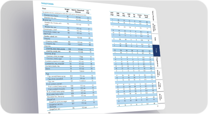 T TABLE FOODS able F Food Weight Approx. Household ILE MET THR VAL CHO Fat Protein Energy oods: (g) Measure (mg) (mg) (mg) (mg) (g) (g) (g) (kcal) For greatest accuracy, weigh food on scales that read in grams. All measures are level. Blackberries, frozen 76 1/2 cup 23 1 30 23 12 0 0.9 48 & C& C & CB Blackberries, raw 72 1/2 cup 14 1 14 14 9 0 0.5 38 BB r rr eads erereads eads Blueberries ealser eals Blueberries, frozen, with 115 1/2 cup 14 7 13 20 26 0 0.5 97 eals sugar Blueberries, raw 74 1/2 cup 17 9 15 23 11 0 0.6 42 Cantaloupe, cubed 80 1/2 cup 17 10 14 26 7 0 0.7 28 F Carambola, cubed, raw 66 1/2 cup 15 7 15 17 5 0 0.4 22 F ats (starfruit) ats Casaba, cubed, raw 85 1/2 cup 26 9 26 26 5 0 0.8 22 Chayote Chayote, cooked 80 1/2 cup 26 1 25 38 4 0 0.5 20 Chayote, raw 203 1 piece 89 2 81 128 9 0 1.7 39 FF F F ruitsruits ruits Cherries ruits Cherries, sour, heavy syrup 128 1/2 cup 13 13 26 26 30 0 0.9 116 Cherries, sweet, raw 69 1/2 cup 14 7 15 7 11 0 0.7 43 Coconut, dried VVV Coconut, dried, no sugar 5 1 Tbsp 14 6 13 21 1 3 0.3 33 V egetablesegetablesegetables Coconut, dried, sugar 5 1 Tbsp 6 3 5 9 3 1 0.2 23 egetables Cranberry sauce with sugar 139 1/2 cup 14 4 14 14 54 0 0.3 209 Cranberries, raw, chopped 55 1/2 cup 18 2 15 25 7 0 0.2 27 Currants, black, raw 56 1/2 cup 22 11 22 34 9 0 0.8 36 Dates 74 1/2 cup 36 16 32 53 55 0 1.8 207 F F 8 1 piece 4 2 3 6 6 0 0.2 23 oods A oods AF F r Figs r ee Figs, canned, heavy syrup 130 1/2 cup 16 4 16 18 30 0 0.5 113 ee Figs, dried, uncooked 37 1/4 cup 33 13 31 45 24 1 1.2 93 Figs, raw 50 1 medium 12 3 12 14 10 0 0.4 37 Fruit cocktail, canned F F oods B oods BF Fruit cocktail, heavy syrup 124 1/2 cup 12 12 12 25 23 0 0.5 91 F r r ee Fruit cocktail, lite syrup 121 1/2 cup 12 12 12 24 18 0 0.5 69 ee Fruit, mixed, heavy syrup 128 1/2 cup 13 13 13 26 24 0 0.5 92 Fruit salad, heavy syrup 128 1/2 cup 13 13 13 13 24 0 0.4 93 Gooseberries, lite syrup 126 1/2 cup 25 13 25 38 24 0 0.8 92 F P oods B Grapefruit r F o L r teinow Grapefruit juice, no sugar 124 4 fl o z 12 4 12 12 11 0 0.7 48 ee Grapefruit section, 127 1/2 cup 8 6 13 14 20 0 0.7 76 lite syrup Grapefruit raw 115 1/2 cup 9 8 15 17 12 0 0.9 48 40 41
