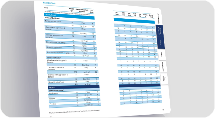 † BABY FOODS B Weight Approx. Household ILE MET THR VAL CHO Fat Protein Energy ab Food y (g) Measure (mg) (mg) (mg) (mg) (g) (g) (g) (kcal) F For greatest accuracy, weigh food on scales that read in grams. All measures are level. oods: Cereals, Jarred ® Strained/2nd Foods & C& C & C & CBB B Banana oatmeal peach 16 1 Tbsp 6 3 5 9 3 0 0.2 13 B rr r r eads eads eads er eads erer 113 1 jar (4 oz) 40 21 36 64 20 0 1.4 87 er eals ealseals Oatmeal with applesauce & 16 1 Tbsp 8 5 7 11 3 0 0.2 12 eals bananas 113 1 jar (4 oz) 55 34 52 77 20 1 1.5 94 F F F Oatmeal with pears and 161 1 Tbsp 8 4 8 11 3 0 0.2 13 F ruits ruits ruits cinnamon 99 1 jar (4 oz) 51 26 47 69 16 1 1 70 ruits Rice with apple and mango 16 1 Tbsp 4 2 3 6 3 0 0.2 11 99 1 pack 24 11 21 35 18 0 1 70 Rice with applesauce 16 1Tbsp 8 4 3 7 3 0 0.1 13 J 113 1 jar (4 oz) 37 28 22 51 24 0 0.9 102 uic Rice with applesauce & bananas 16 1 Tbsp 8 3 6 11 3 0 0.2 13 es 113 1 jar (4 oz) 54 23 45 77 19 0 1.4 90 Junior/3rd Foods® Mixed cereal with apples & 15 1 Tbsp 6 4 5 9 2 0 0.2 11 V bananas 170 1 Jar (6 oz) 73 41 58 99 31 1 2 141 egetables F Oatmeal with apples & 15 1 Tbsp 6 3 4 8 2 0 0.2 10 oods BF r cinnamon 170 1 Jar (6 oz) 66 37 49 90 25 1 1.9 116 ee Oatmeal with applesauce & 15 1 Tbsp 7 5 7 10 2 0 0.2 11 bananas F F oods r 170 1 Jar (6 oz) 83 53 78 117 27 1 2.2 128 ee Rice with mixed fruit 15 1 Tbsp 7 4 6 10 3 0 0.1 12 170 1 jar (6 oz) 80 46 70 114 31 0 1.5 134 FRUITS Strained/1st Foods® Applesauce 15 1 Tbsp 1 0 1 2 2 0 0 8 71 1 jar (2.5 oz) 4 0 4 8 10 0 0 40 Banana 15 1 Tbsp 4 1 4 7 3 0 0.2 13 17 1 jar (2.5 oz) 19 6 19 33 15 0 1 60 Peaches 16 1 Tbsp 3 1 3 4 2 0 0 8 71 1 jar (2.5 oz) 12 6 11 16 10 0 0.5 40 † ® ® ® The food values are equivalent for Gerber , Beech-Nut , and Heinz unless otherwise stated. 12 13