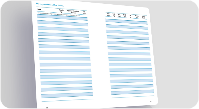Use for your additional food choices. Weight Approx. Household ILE MET THR VAL CHO Fat Protein Energy Food Weight Approx. Household ILE PHE TYR CHO Fat Protein Energy Food (g) Measure (mg) (mg) (mg) (mg) (g) (g) (g) (kcal) (g) Measure (mg) (mg) (mg) (g) (g) (g) (kcal) For greatest accuracy, weigh food on scales that read in grams. All measures are level. For greatest accuracy, weigh food on scales that read in grams. All measures are level. 68 69