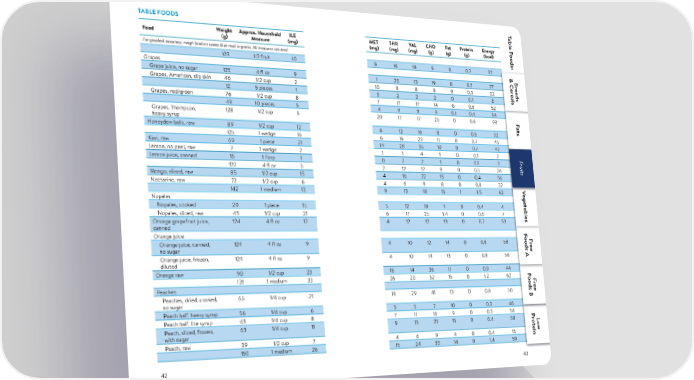 T TABLE FOODS able F Food Weight Approx. Household ILE MET THR VAL CHO Fat Protein Energy oods: (g) Measure (mg) (mg) (mg) (mg) (g) (g) (g) (kcal) For greatest accuracy, weigh food on scales that read in grams. All measures are level. 123 1/2 fruit 10 9 16 18 9 0 0.7 37 & C& C Grapes & CB BB r rr eads erereads eads Grape juice, no sugar 125 4 fl o z 9 1 20 13 19 0 0.7 77 ealser eals Grapes, American, slip skin 46 1/2 cup 2 10 8 8 8 0 0.3 32 eals 12 5 pieces 1 3 2 2 2 0 0.1 8 Grapes, red/green 76 1/2 cup 8 7 17 17 14 0 0.6 52 49 10 pieces 5 4 11 11 9 0.1 0.4 34 F Grapes, Thompson, 128 1/2 cup 5 20 17 17 25 0 0.6 93 F ats heavy syrup ats Honeydew balls, raw 89 1/2 cup 12 4 12 16 8 0 0.5 32 125 1 wedge 16 6 16 23 11 0 0.7 45 Kiwi, raw 69 1 piece 21 14 28 35 10 0 0.7 42 Lemon, no peel, raw 7 1 wedge 2 1 1 4 1 0 0.1 2 FF F F ruitsruits ruits Lemon juice, canned 15 1 Tbsp 1 0 2 2 1 0 0.1 3 ruits 122 4 fl o z 5 2 12 12 8 0 0.5 26 Mango, sliced, raw 85 1/2 cup 15 4 16 22 15 0 0.4 56 Nectarine, raw 72 1/2 cup 6 4 6 9 8 0 0.8 32 VVV 142 1 medium 13 9 13 18 15 1 1.5 62 V egetablesegetablesegetables Nopales egetables Nopales, cooked 29 1 piece 15 5 12 18 1 0 0.4 4 Nopales, sliced, raw 43 1/2 cup 21 6 17 25 1.4 0 0.6 7 Orange grapefruit juice, 124 4 fl o z 12 4 12 12 13 0 0.7 53 canned F Orange juice F oods A oods AF F r Orange juice, canned, 124 4 fl o z 9 4 10 12 14 0 0.8 58 r ee no sugar ee Orange juice, frozen, 124 4 fl o z 9 4 10 14 13 0 0.8 56 diluted Orange raw 90 1/2 cup 23 18 14 36 11 0 0.9 44 F F 131 1 medium 33 26 20 52 15 0 1.2 62 oods B oods BF F r Peaches r ee Peaches, dried, cooked, 65 1/4 cup 21 18 29 41 13 0 0.8 50 ee no sugar Peach half, heavy syrup 56 1/4 cup 6 3 5 7 10 0 0.3 46 Peach half, lite syrup 63 1/4 cup 8 7 11 16 9 0 0.3 34 F P oods B r F Peach, sliced, frozen, 63 1/4 cup 11 9 15 21 15 0 0.4 58 o L r teinow with sugar ee Peach, raw 39 1/2 cup 7 4 6 9 4 0 0.4 15 150 1 medium 26 15 24 33 14 0 1.4 59 42 43
