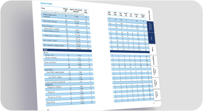 T TABLE FOODS able F Food Weight Approx. Household ILE MET THR VAL CHO Fat Protein Energy oods: (g) Measure (mg) (mg) (mg) (mg) (g) (g) (g) (kcal) For greatest accuracy, weigh food on scales that read in grams. All measures are level. Potato salad, home- 16 1 Tbsp 23 11 19 28 2 1 0.4 22 & C& C & C prepared & CBB B B r rr r 63 1/4 cup 89 42 73 108 7 5 1.7 90 ereads eads eads erereads er ® eals ealseals Tater Tots , Ore Ida 10 1piece 9 3 8 11 2 0 0.2 13 eals 28 1 oz 24 7 24 30 6 1 0.6 37 Sweet Potatoes Sweet potato, candied 105 1piece 33 17 48 50 34 4 0.9 172 Sweet potato, no skin 21 1 Tbsp 17 9 17 23 4 0 0.3 16 F F F ats ats 82 1/4 cup 67 34 67 89 15 0 1.1 62 ats Sweet potato, with skin 13 1 Tbsp 9 5 14 14 3 0 0.3 12 50 1/4 cup 35 19 54 55 10 0 1 45 Yam, cubed, cooked 9 1 Tbsp 5 2 5 5 2 0 0.1 10 34 1/4 cup 17 7 18 20 9 0 0.5 39 F F ruits Yam, Hawaiian, cooked, cubed 9 1 Tbsp 5 2 5 6 2 0 0.2 7 ruits 36 1/4 cup 21 8 25 26 7 0 0.6 30 FATS Butter VV V Butter, stick 14 1 Tbsp 7 3 5 8 0 12 0.1 102 egetablesegetables Butter, whipped 3 1 tsp 2 1 1 2 0 2 0 22 egetables 9 1 Tbsp 5 2 3 5 0 8 0.1 68 Cream substitute 5 1 tsp 3 1 2 3 1 0 0 13 14 1 Tbsp 8 2 6 8 5 2 0.1 38 28 1 oz 16 4 12 16 10 4 0.2 71 F ® F oods A Cool Whip oods AF F r ® r ee Cool Whip , extra creamy 1.5 1 tsp 2 1 2 2 0 0 0 5 ee 4.5 1 Tbsp 7 3 5 7 1 1 0.1 15 Cool Whip®, regular 1.5 1 tsp 1 1 1 2 0 0 0 4 4.5 1 Tbsp 4 2 3 5 1 1 0.1 13 F Cream substitute, powdered 2 1 tsp 6 3 4 7 1 1 0.1 11 F oods B oods BF F Margarine r r ee Margarine, imitation 5 1 tsp 2 1 1 2 0 2 0 17 ee 14 1 Tbsp 4 1 3 4 0 6 0.1 48 Margarine 5 1 tsp 3 1 2 3 0 4 0.1 36 14 1 Tbsp 7 3 6 8 0 11 0.1 100 F P oods B r F Margarine, soft tub 5 1 tsp 3 1 2 3 0 4 0 36 o L r teinow 14 1 Tbsp 7 3 4 7 0 11 0.1 100 ee Mayonnaise 5 1 tsp 3 1 2 3 1 2 0.1 20 15 1 Tbsp 8 3 7 8 4 5 0.1 57 36 37