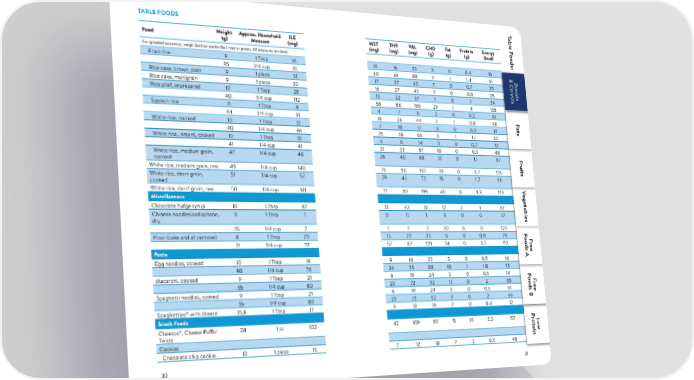T TABLE FOODS able F Food Weight Approx. Household ILE MET THR VAL CHO Fat Protein Energy oods: (g) Measure (mg) (mg) (mg) (mg) (g) (g) (g) (kcal) For greatest accuracy, weigh food on scales that read in grams. All measures are level. Fried rice 9 1 Tbsp 16 10 16 23 3 0 0.4 16 & C& C & C & CBB B 35 1/4 cup 61 40 61 88 11 1 1.4 61 B r rr r ereads eads eads erereads Rice cake, brown, plain 9 1 piece 31 17 27 43 7 0 0.7 35 er eals ealseals Rice cake, multigrain 9 1 piece 32 16 27 43 7 0 0.8 35 eals Rice pilaf, unprepared 10 1 Tbsp 28 15 22 37 7 0 1 34 40 1/4 cup 112 58 88 150 29 1 4 138 Spanish rice 11 1 Tbsp 8 4 7 11 2 0 0.2 10 F 44 1/4 cup 31 18 26 44 7 1 0.8 38 F ats White rice, cooked 10 1 Tbsp 12 7 10 17 3 0 0.3 13 ats 40 1/4 cup 46 25 38 66 11 1 1.1 62 White rice, instant, cooked 10 1 Tbsp 10 5 8 14 3 0 0.2 12 41 1/4 cup 41 21 33 57 10 0 0.9 48 F White rice, medium grain, 47 1/4 cup 48 26 40 68 13 0 1.1 61 F ruits cooked ruits White rice, medium grain, raw 49 1/4 cup 140 76 116 197 39 0 3.2 176 White rice, short grain, 51 1/4 cup 52 29 43 73 15 0 1.2 66 cooked VV V White rice, short grain, raw 50 1/4 cup 141 77 117 199 40 0 3.3 179 egetablesegetables Miscellaneous egetables Chocolate fudge syrup 19 1 Tbsp 42 13 43 51 12 2 1 67 Chinese noodles/cellophane, 9 1 Tbsp 1 0 0 1 8 0 0 32 dry 35 1/4 cup 2 1 2 3 30 0 0 123 F F Flour (cake and all purpose) 8 1 Tbsp 29 15 22 33 6 0 0.8 29 oods A oods AF F r 31 1/4 cup 111 57 87 129 24 0 3.2 113 r ee Pasta ee Egg noodles, cooked 10 1 Tbsp 19 9 14 22 3 0 0.5 14 40 1/4 cup 76 34 55 88 10 1 1.8 55 F Macaroni, cooked 9 1 Tbsp 21 6 19 24 3 0 0.5 14 F oods B oods BF 35 1/4 cup 80 23 72 92 11 0 2 55 F r r ee Spaghetti noodles, cooked 9 1 Tbsp 21 6 19 24 3 0 0.5 14 ee 35 1/4 cup 80 23 72 92 11 0 2 55 Spaghettios® with cheese 15.8 1 Tbsp 17 9 13 19 2 0 0.4 12 Snack Foods F P oods B ® r F Cheetos , Cheese Puff s/ 28 1 oz 102 42 109 113 15 10 2.2 157 o L r teinow Twists ee Cookies Chocolate chip cookie 10 1 piece 15 7 12 18 7 2 0.5 48 30 31