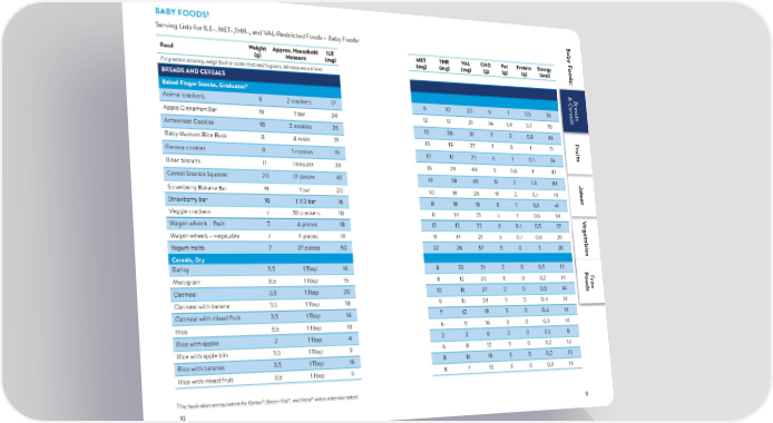 † BABY FOODS B † ab Serving Lists for ILE-, MET-,THR-, and VAL-Restricted Foods – Baby Foods y F Food Weight Approx. Household ILE MET THR VAL CHO Fat Protein Energy oods: (g) Measure (mg) (mg) (mg) (mg) (g) (g) (g) (kcal) For greatest accuracy, weigh food on scales that read in grams. All measures are level. & C& C & C BREADS AND CEREALS & CBB B B rr r ® r eads eads erereads er eads Baked Finger Snacks, Graduates er eals ealseals Animal crackers, 8 2 crackers 17 6 10 20 6 1 0.5 36 eals Apple Cinnamon Bar 19 1 bar 24 12 17 31 14 1.4 0.1 70 Arrowroot Cookies 10 2 cookies 26 13 20 31 7 2 0.9 46 F F ruits Baby Mumum Rice Rusk 8 4 rusks 21 10 19 27 7 0 1 31 ruits Banana cookies 8 1 cookies 19 10 12 23 6 1 0.5 34 Biter biscuits 11 I biscuits 38 16 29 44 9 0.6 1 43 Cereal Snackin Squares 20 12 pieces 41 19 28 49 15 2 1.3 84 J Strawberry Banana Bar 19 1 bar 20 10 13 26 13 2 0.7 70 uic Strawberry bar 10 1-1/3 bar 16 8 16 18 8 1 0.5 41 es Veggie crackers 7 10 crackers 18 8 14 21 5 1 0.6 34 V Wagon wheels – fruit 7 4 pieces 18 12 12 22 6 0.1 0.5 27 egetables Wagon wheels – vegetable 7 4 pieces 19 11 14 21 5 0.7 0.6 29 F oods BF Yogurt melts 7 27 pieces 50 22 26 57 5 0 1 30 r Cereals, Dry ee Barley 3.5 1 Tbsp 16 8 33 21 2 0 0.5 13 FFFFFF Multigrain 3.5 1 Tbsp 15 8 12 20 3 0 0.2 14 oods oods oods rrr ee Oatmeal 3.5 1 Tbsp 20 10 16 27 2 0 0.5 14 ee ee Oatmeal with banana 3.5 1 Tbsp 18 9 15 24 3 0 0.4 14 Oatmeal with mixed fruit 3.5 1 Tbsp 14 7 12 19 3 0 0.4 14 Rice 3.5 1 Tbsp 10 6 11 16 3 0 0.3 14 Rice with apples 2 1 Tbsp 4 3 3 6 2 0 0.1 8 Rice with apple bits 3.5 1 Tbsp 9 6 8 12 3 0 0.2 14 Rice with bananas 3.5 1 Tbsp 16 8 16 19 3 0 0.2 13 Rice with mixed fruit 3.5 1 Tbsp 9 8 7 13 3 0 0.3 14 † ® ® ® The food values are equivalent for Gerber , Beech-Nut , and Heinz unless otherwise stated. 10 11