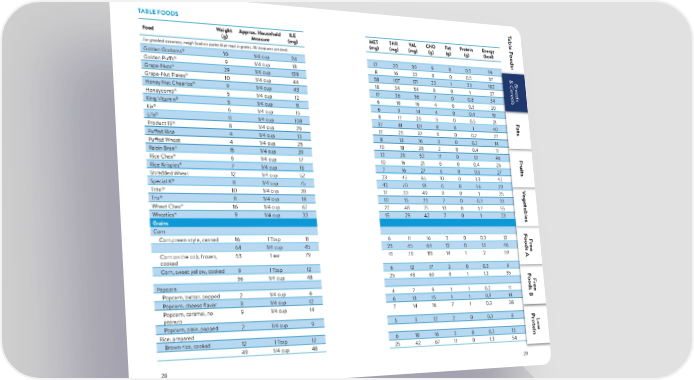 T TABLE FOODS able F Food Weight Approx. Household ILE MET THR VAL CHO Fat Protein Energy oods: (g) Measure (mg) (mg) (mg) (mg) (g) (g) (g) (kcal) For greatest accuracy, weigh food on scales that read in grams. All measures are level. ® Golden Grahams 10 1/4 cup 24 12 20 30 9 0 0.5 39 & C& C & C Golden Puff s® 9 1/4 cup 18 8 16 22 8 0 0.5 37 & CBB B B rr r ® r eads eads erereads er eads Grape-Nuts 29 1/4 cup 139 58 107 171 23 1 3.1 102 er ealseals eals Grape-Nut Flakes® ® 10 1/4 cup 44 18 34 54 8 0 1 37 eals Honey Nut Cheerios 9 1/4 cup 43 17 36 56 7 0 0.8 34 Honeycomb® 5 1/4 cup 12 6 10 16 4 0 0.3 20 King Vitamin® 5 1/4 cup 11 6 9 14 4 0 0.4 19 ® F Kix 6 1/4 cup 15 8 17 20 5 0 0.5 21 F ats ® ats Life 11 1/4 cup 108 37 81 121 8 0 1 40 Product 19® 8 1/4 cup 29 17 25 37 6 0 0.7 27 Puff ed Rice 4 1/4 cup 13 8 13 16 3 0 0.2 14 Puff ed Wheat 4 1/4 cup 25 10 18 28 2 0 0.4 11 ® Raisin Bran 15 1/4 cup 39 13 35 53 11 0 1.1 46 F F ruits Rice Chex® 6 1/4 cup 17 10 16 21 6 0 0.4 25 ruits Rice Krispies® 7 1/4 cup 18 7 16 27 6 0 0.5 27 Shredded Wheat 12 1/4 cup 52 23 43 65 10 0 1.3 42 Special K® 8 1/4 cup 75 42 70 91 6 0 1.6 29 VV ® V egetablesegetables Total 10 1/4 cup 39 17 33 49 8 0 1 35 egetables Trix® 8 1/4 cup 18 10 15 23 7 0 0.3 33 Wheat Chex® 16 1/4 cup 67 27 48 75 13 0 1.7 55 ® Wheaties 9 1/4 cup 33 15 29 42 7 0 1 33 Grains Corn F F oods A oods AF Corn,cream style, canned 16 1 Tbsp 11 6 11 16 3 0 0.3 12 F r r ee 64 1/4 cup 45 23 45 64 12 0 1.1 46 ee Corn on the cob, frozen, 63 1 ear 79 41 79 113 14 1 2 59 cooked Corn, sweet yellow, cooked 9 1 Tbsp 12 6 12 17 2 0 0.3 9 F 36 1/4 cup 48 25 48 69 8 1 1.2 35 F oods B oods BF Popcorn F r r ee Popcorn, butter, popped 2 1/4 cup 6 4 7 9 1 1 0.2 11 ee Popcorn, cheese fl avor 3 1/4 cup 12 6 13 15 1 1 0.3 14 Popcorn, caramel, no 9 1/4 cup 14 7 14 16 7 1 0.3 38 peanuts F P Popcorn, plain, popped 2 1/4 cup 9 5 9 12 2 0 0.3 8 oods B r F o L r teinow Rice, prepared ee Brown rice, cooked 12 1 Tbsp 12 6 10 16 3 0 0.3 13 49 1/4 cup 48 25 42 67 11 0 1.3 54 28 29