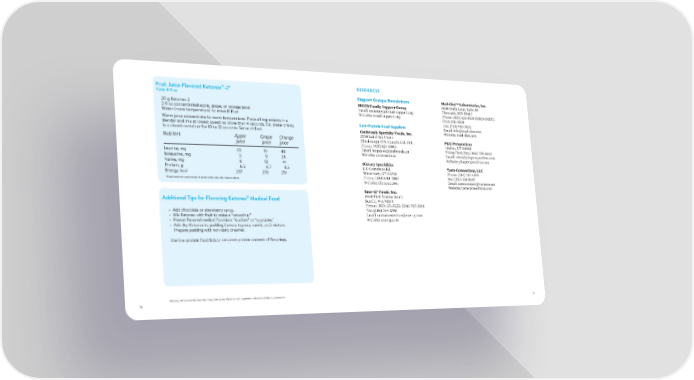 RESOURCES ® Fruit Juice-Flavored Ketonex -2* Support Groups/Newsletters Med-Diet™ Laboratories, Inc. Yield: 8 fl oz 3600 Holly Lane, Suite 80 MSUD Family Support Group 20 g Ketonex-2 Email: [email protected] Plymouth, MN 55447 1 3 fl oz concentrated apple, grape, or orange juice Website: msud-support.org Phone: (800) 633-3438 (MED-DIET); Water (room temperature) to make 8 fl oz (763) 550-2020 Warm juice concentrate to room temperature. Place all ingredients in a Low-Protein Food Suppliers Fax: (763) 550-2022 blender and mix at lowest speed no more than 4 seconds. Or, shake briskly Email: [email protected] in a closed container for 10 to 12 seconds. Serve chilled. Canbrands Specialty Foods, Inc. Website: med-diet.com Nutrient Apple Grape Orange 3500 Laird Rd. Unit 4 PKU Perspectives Mississauga, ON, Canada L5L 5Y4 Lindon, UT 84042 juice juice juice Phone: (905) 829-6003 Phone/Text/Fax: (866) 758-3663 Leucine, mg 33 15 48 Email: [email protected] Email: [email protected] Website: canbrands.ca Website: pkuperspectives.com Isoleucine, mg 0 9 28 Valine, mg 6 13 41 Dietary Specialties Taste Connections, LLC Protein, g 6.5 6.7 8.5 8 S. Commons Rd. Phone: (310) 413-6499 Energy, kcal 257 276 251 Waterbury, CT 06704 Fax: (310) 318-8407 *Please check with your dietitian or doctor before using this recipe in infants. Phone: (888) 640-2800 Email: [email protected] Website: dietspec.com Website: tasteconnections.com Ener-G® Foods, Inc. ® 5960 First Avenue South Additional Tips for Flavoring Ketonex Medical Food Seattle, WA 98108 Phone: (800) 331-5222; (206) 767-3928 • Add chocolate or strawberry syrup. Fax: (206) 764-3398 • Mix Ketonex with fruit to make a “smoothie.” Email: [email protected] • Freeze flavored medical food into “slushies” or “popsicles.” Website: ener-g.com • Add dry Ketonex to pudding (lemon, tapioca, vanilla, etc) mixture. Prepare pudding with non-dairy creamer. Use low-protein food lists to calculate protein content of flavorings. Ketostix, Jell-O, Kool-Aid, Popsicles, Tang, Tylenol, and Wyler’s are not registered trademarks of Abbott Laboratories. 16 17