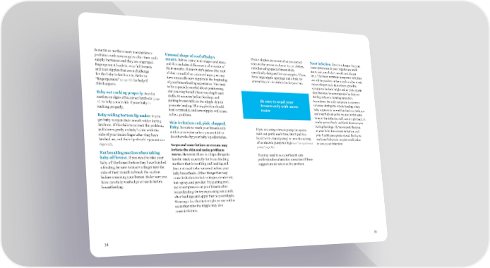 Sometimes mothers start to experience Unusual shape of roof of baby’s If your nipples are so sore that you cannot Yeast infection. Yeast is a fungus that can problems with sore nipples after their milk mouth. Babies come in all shapes and sizes, tolerate the pressure of your bra or clothes, cause symptoms in your nipples and milk supply increases and they are engorged. and this includes difference in the inside of consider using special breast shells ducts and your baby’s mouth and diaper Engorgement leads to very full breasts their mouths. If your baby’s palate (the roof specifically designed for sore nipples. These area. The most common symptoms in babies and taut nipples that are a challenge of their mouth) has a dome shape, you may have large nipple openings and a hole for are white patches in the mouth and/or a red, for the baby to latch on to. Refer to have unusually sore nipples in the beginning promoting air circulation inside your bra. raised diaper rash. In mothers, possible “Engorgement” (page 30) for help if of your breastfeeding experience. You need symptoms include bright red or pink nipple this happens. to be especially careful about positioning, skin that may be accompanied by flaky or Baby not sucking properly. See the and you may benefit from wearing breast itching skin or a burning sensation. section on signs of incorrect latch-on (page shells 30 minutes before feedings and Be sure to wash your Sometimes the only symptom is extreme 15) to help you decide if your baby is putting breast milk on the nipple skin to breasts only with warm soreness during the whole feeding when sucking properly. promote healing. The nipple skin should water baby appears to be well latched on. Both you heal eventually, and sore nipples will cease and your baby must be treated at the same Baby rolling bottom lip under. Try to to be a problem. time or the infection will come right back. It get baby to open their mouth wider during Skin irritation: red, pink, chapped, can be passed back and forth between you latch-on. If this fails to correct the problem, flaky. Be sure to wash your breasts only during feedings. If you suspect that you pull down gently on baby’s chin with the If you are using a breast pump, be sure to or your baby has a yeast infection, call side of your index finger after they have with warm water unless you are told to start out gently each time. Don’t pull too your health care professional. Both you latched on, and their lip should open out (see do otherwise by your baby’s pediatrician. hard (with a hand pump) or turn the setting and your baby may require medication Figure 12). Soaps and some lotions or creams may of an electric pump too high (see “Using a breast to cure yeast infection. irritate the skin and make problems pump,” page 38). Not breaking suction when taking worse. However, there is a hypoallergenic You may need to see your health care baby off breast. If you need to take your lanolin made especially for breastfeeding professional or a lactation consultant if these baby off the breast before they have finished mothers that is soothing and healing and suggestions do not solve the problem. a feeding, be sure to insert a finger into the does not need to be removed before your side of their mouth to break the suction baby breastfeeds. Other things that may before removing your breast. Make sure you cause irritation include cologne, deodorant, have carefully washed your hands before hair spray, and powder. Try putting cool, breastfeeding. moist compresses on your breasts after breastfeeding. Or try expressing some milk after feedings and apply that to your nipple. Wearing a bra that is too tight or one with a seam that rubs the nipple may also cause irritation. 34 35