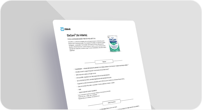 ® EleCare (for Infants) Amino acid-based powder infant formula with iron ELECARE is a nutritionally complete amino acid-based formula for infants who cannot tolerate intact or hydrolyzed protein. It is indicated for the dietary management of protein maldigestion, malabsorption, food allergies, short-bowel syndrome, eosinophilic GI disorders, GI-tract impairment, or other conditions in which an amino acid-based diet is required. For infants 0 to 12 months of age. For oral or tube feeding. Use under medical supervision. Features • 1,* Hypoallergenic —virtually eliminating the potential for an allergic reaction to the formula in multiple-food-allergic children. • 2,* Clinically shown to support the growth of exclusively formula-fed infants. • 100% free amino acids as nitrogen source. • DHA and ARA, ingredients that help support brain and eye development. • 33% of fat blend as MCTs, an easily digested and well-absorbed fat source. • Supported by strict manufacturing standards and ELISA (Enzyme-Linked ImmunoSorbent Assay) testing. • Does not contain milk protein, soy protein, fructose, galactose, lactose, or gluten. • Halal. • Kosher made with pareve ingredients. * Study conducted with a previous formulation of EleCare Unflavored without DHA/ARA. 1 Sicherer SH, et al. J Pediatr. 2001;138:688-693. 2 Borschel MW, et al. Clin Pediatr. 2013;52(10):910-917. Safety Precautions • Never use a microwave oven to warm formula. Serious burns can result. • Powdered infant formulas are not sterile and should not be fed to premature infants or infants who might have immune problems unless directed and supervised by your baby's doctor. • Not for IV use. Availability List Number Item 55251 EleCare Powder / 14.1 oz (400 g) Can / 6 ct Ingredients Unflavored Powder Corn Syrup Solids (55%), High Oleic Safflower Oil (9%), Medium Chain Triglycerides (8%), Soy Oil (7%), L-Glutamine (2%). Less than 2% of: Schizochytrium Sp. Oil*, M. Alpina Oil†, L-Asparagine, L-Leucine, L-Lysine, DATEM, Calcium Phosphate, L-Valine, Potassium Phosphate, L-Isoleucine, L-Arginine, L-Phenylalanine, L-Tyrosine, L-Threonine, Potassium Citrate, Sodium Citrate, L-Proline, L-Serine, L- Abbott Nutrition Abbott Laboratories For more information contact your © 2022 Abbott Laboratories Inc. Columbus, OH 43219 Abbott Nutrition Representative or visit: Page 1 of 4 Last updated: 09/13/2024 1-800-227-5767 www.abbottnutrition.com