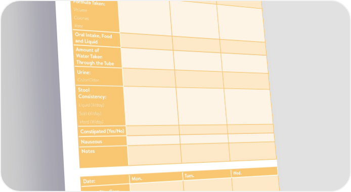 Tube Feeding Monitoring Checklist Date: Mon. Tues. Wed. Weight Amount of Formula Taken: Volume Calories Rate Oral Intake, Food and Liquid Amount of Water Taken Through the Tube Urine: Color/Odor Stool Consistency: Liquid (#/day) Soft (#/day) Hard (#/day) Constipated (Yes/No) Nauseous Notes Date: Mon. Tues. Wed. Stoma Site Care Skin: Redness Drainage Granulation tissue Skin breakdown Daily Site Care 26