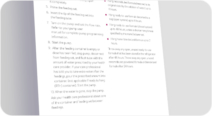 Follow these steps: Hang Time and Storage 1. Hang the filled feeding container or place Cover any unused formula and write the date on it in an ambulatory carrier. it. Store it in the refrigerator. 2. Connect the feeding set to the pump. For formula that has been hung for a feeding, 3. Remove the cap from the end of the follow the guidelines below: feeding set. 4. If your feeding set has a clamp, open n Hang reconstituted formula (restored to its it completely. original state by the addition of water) up to 5. Prime the feeding set. 4 hours. 6. Insert the tip of the feeding set into n Hang ready-to-use formula decanted to a the feeding tube. bag (open system) up to 8 hours. 7. Turn on the pump and set the flow rate. n Hang ready-to-use formula (closed system) Refer to your pump user up to 48 hours, unless a shorter hang time is manual for complete pump programming specified by the manufacturer set. information. n Hang home blenderized formula up to 2 8. Start the pump. hours. 9. After the feeding container is empty or Throw away any open, unused ready-to-use dose has been fed, stop pump, disconnect formula that has been stored in the refrigerator from feeding set, and flush tube with the after 48 hours. Throw away any open, unused amount of water prescribed by your health reconstituted powdered formula or blenderized care provider. If your care professional formula after 24 hours. has told you to take extra water after the feedings, pour the prescribed amount into container. (not applicable if ready to hang (RTH) container). Start the pump. 10. When the water is gone, stop the pump. Ask your health care professional about care of the container and feeding set between feedings. Guide to Adult Tube Feeding | 9