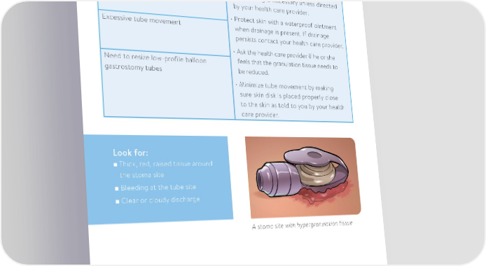 Hypergranulation Tissue Causes Prevention and Treatment Trapped moisture • Keep skin around the tube dry. Clean site with soap and water or non-toxic Tube causes a foreign body reaction, skin cleanser. resulting in rapid development of thick, • No dressing is necessary unless directed red tissue by your health care provider. • Protect skin with a waterproof ointment Excessive tube movement when drainage is present. If drainage persists contact your health care provider. • Ask the health care provider if he or she Need to resize low-profile balloon feels that the granulation tissue needs to gastrostomy tubes be reduced. • Minimize tube movement by making sure skin disk is placed properly close to the skin as told to you by your health care provider. Look for: n Thick, red, raised tissue around the stoma site n Bleeding at the tube site n Clear or cloudy discharge A stoma site with hypergranulation tissue 18
