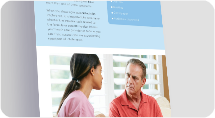 Tube Feeding Intolerance It is important to monitor and document the presence (or absence) of symptoms Look for: associated with intolerance, as it can lead n Nausea to complications such as dehydration. n Vomiting Typically, patients experiencing n Diarrhea intolerance to tube feeding will have more than one of these symptoms. n Bloating When you show signs associated with n Constipation intolerance, it is important to determine n Abdominal discomfort whether the intolerance is related to the formula or something else. Inform your health care provider as soon as you can if you suspect you are experiencing symptoms of intolerance. Guide to Adult Tube Feeding | 13
