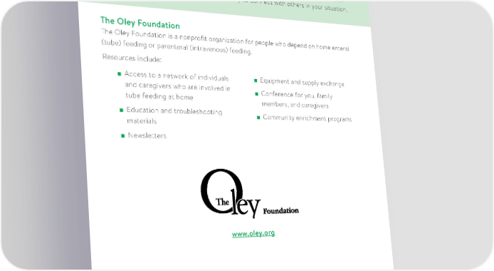Finding Community Support With support and guidance, you can take control of the tube feeding process and adjust successfully to this new lifestyle change. Visit the link below to find educational resources, support groups and the opportunity to connect with others in your situation. The Oley Foundation The Oley Foundation is a nonprofit organization for people who depend on home enteral (tube) feeding or parenteral (intravenous) feeding. Resources include: n Access to a network of individuals n Equipment and supply exchange and caregivers who are involved in n Conference for you, family tube feeding at home members, and caregivers n Education and troubleshooting n Community enrichment programs materials n Newsletters www.oley.org Call 1-800-776-OLEY (6359) or visit Oley.org for more information about tube feeding. Abbott is a supporter of The Oley Foundation. 4