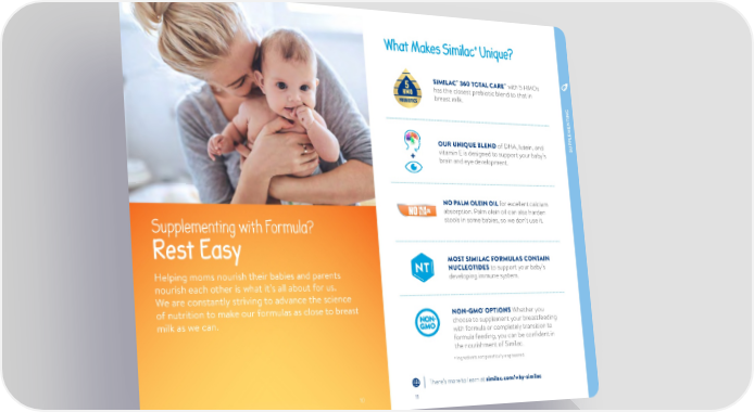® What Makes Similac Unique? ® ® SIMILAC 360 TOTAL CARE with 5 HMOs has the closest prebiotic blend to that in breast milk. OUR UNIQUE BLEND of DHA, lutein, and vitamin E is designed to support your baby’s SUPPLEMENTING brain and eye development. NO PALM OLEIN OIL for excellent calcium absorption. Palm olein oil can also harden Supplementing with Formula? stools in some babies, so we don’t use it. Rest Easy MOST SIMILAC FORMULAS CONTAIN Helping moms nourish their babies and parents NUCLEOTIDES to support your baby’s developing immune system. nourish each other is what it’s all about for us. We are constantly striving to advance the science of nutrition to make our formulas as close to breast * milk as we can. NON-GMO OPTIONS Whether you choose to supplement your breastfeeding with formula or completely transition to formula feeding, you can be confident in the nourishment of Similac. Ingredients not genetically engineered. * There’s more to learn at similac.com/why-similac 10 11