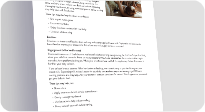 CHALLENGES & ADVICE FOR MILK PRODUCTION Let-down (the flow of milk) If your breast milk comes out too fast, your baby may have trouble swallowing all of it. This is common with newborns. Your baby becomes better at nursing, usually by 2 months of age. To help your baby, try pumping some milk before nursing or stop nursing your baby several times during the feeding. This gives your baby a chance to catch a breath, burp, or swallow. For some mothers, breast milk comes down very slowly. Relaxing, massaging your breast, or using warm compresses before nursing may help your milk flow better. These tips may also help let-down occur faster: • Find a quiet nursing area • Focus on your baby • Enjoy the close contact with your baby • Lie down while nursing Emotions Emotions or stress can affect let-down and may reduce the supply of breast milk. Try to relax and continue to breastfeed or express your breast milk. This allows your milk supply to return to normal. Engorgement (full or hard breasts) This sometimes occurs if the baby does not breastfeed often or long enough during the first 3 to 5 days after birth, when your milk first comes in. There are many reasons for this. Some babies refuse the breast and others try to nurse but have problems latching on. When your breasts are hard and full, the nipples may flatten. This makes it hard for your baby to latch. If one or both breasts become full or hard between feedings, use a breast pump or your hand to express your breast milk. Expressing milk makes it easier for your baby to nurse because you are less engorged. Different nursing positions also may help. Ask your doctor or lactation consultant for support if this happens and you cannot get your baby to feed. These tips may help, too: • Nurse often • Apply a warm washcloth or take warm showers • Gently massage your breast • Use ice packs to help reduce swelling • Pump some of your milk before nursing Overcoming common breastfeeding concerns Page 2 of 4